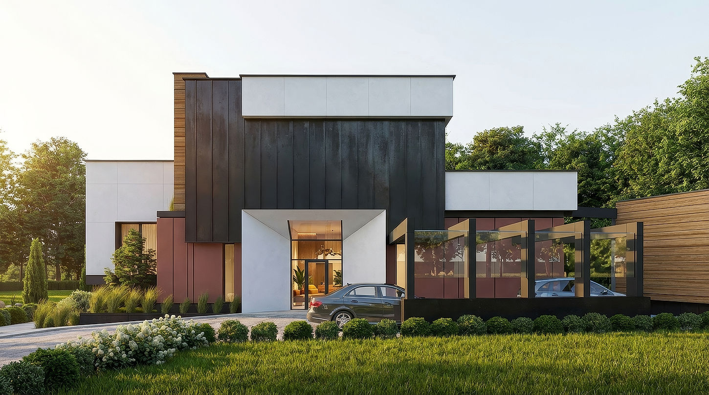 Characterised by clean geometry, generous glazing, and refined material contrasts, this design establishes a modern and inviting atmosphere. The interplay between warm textures and sleek architectural lines enhances visual balance, while the integration of terraces and landscaped areas creates a smooth dialogue between indoor comfort and the surrounding environment. Overall, the composition delivers a contemporary and harmonious residential exterior with a subtly sophisticated presence.