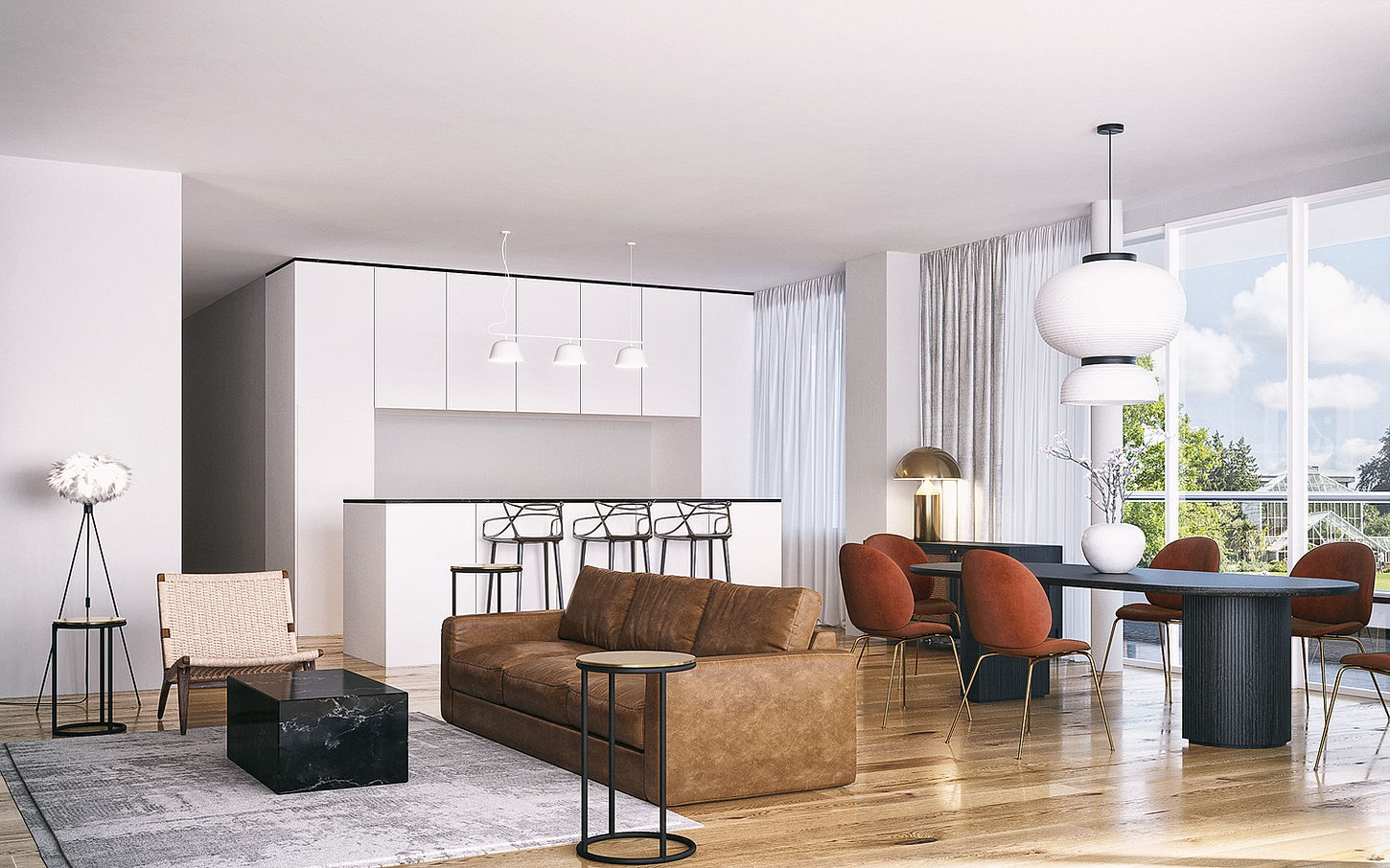 A refined open-plan living and dining area where comfort and elegance meet. The space is defined by a harmonious colour palette, natural materials, and carefully arranged furniture that creates a seamless flow between functions. Subtle zoning through rugs and lighting separates the areas without breaking the unity. Multi-functional pieces and layered illumination ensure both practicality and atmosphere, resulting in a modern, inviting environment ideal for relaxation and gatherings.